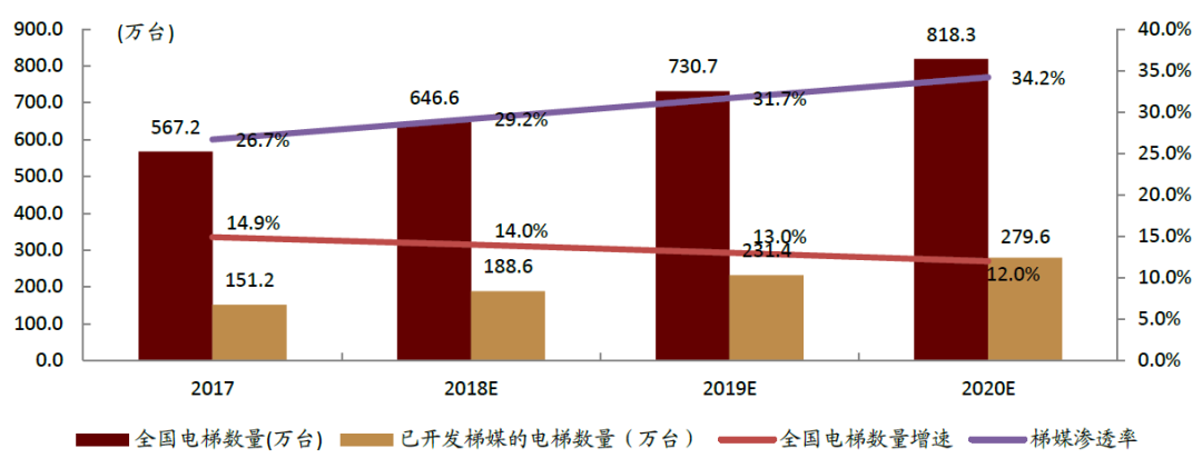 Forecast of the number of elevators in China and the number of elevators that have developed elevator media in 2017-2020